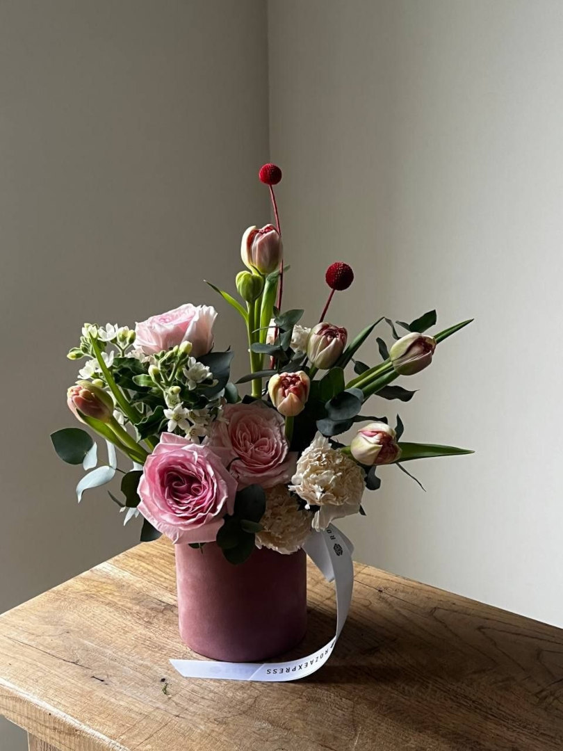 Гвоздика Лиззи 3 шт, краспедия микс 2 шт, оксипеталум белый 2 шт, роза Пинк Охара 3 шт, тюльпан персиковый 6 шт, эвкалипт, персиковая бархатная коробка.